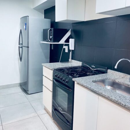 – Cocina semi-integrada moderna con 2 artefactos de cocina a gas (ideal Kasher), heladera, y utensilios de cocina.